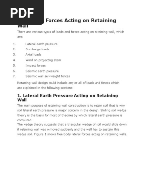 Forces on retaining walls 6. Surcharge loads acting on retaining wall surcharge loads acting on retaining walls are additional vertical loads that used to the backfill soil above the top of the wall. Based on our example in figure a 1 we have the forces due to soil pressure due to water and surcharge load to consider. The live load surcharge is positioned to produce the maximum design load.